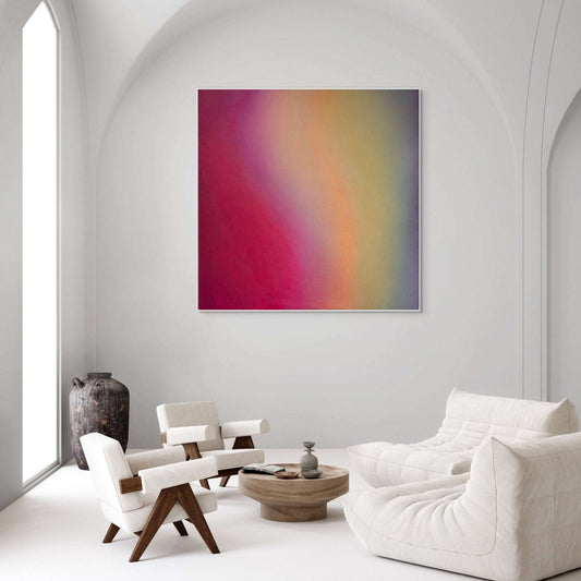 Soft pink, red, purple, and yellow gradients evoke harmony and warmth in this vibrant piece.